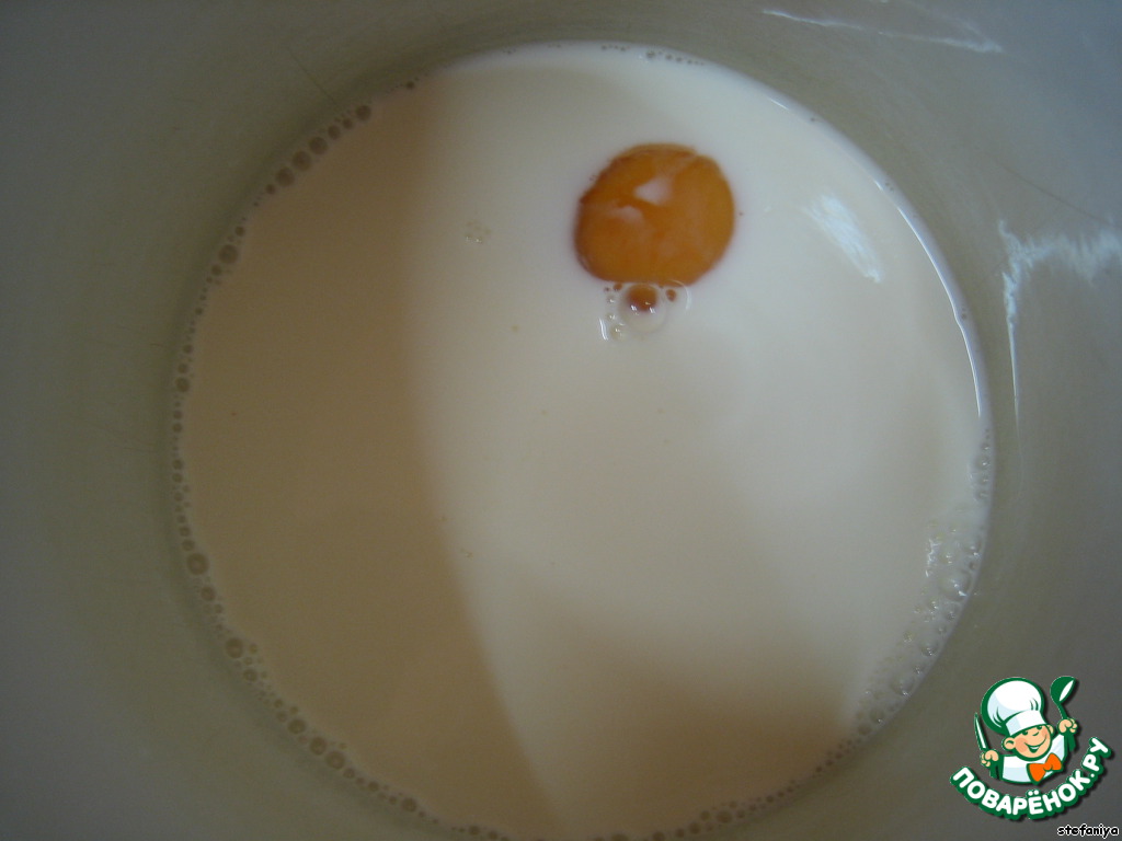 взбиваем 1 яйцо со стаканом тёплого молока и смешиваем с подошедшей опарой.