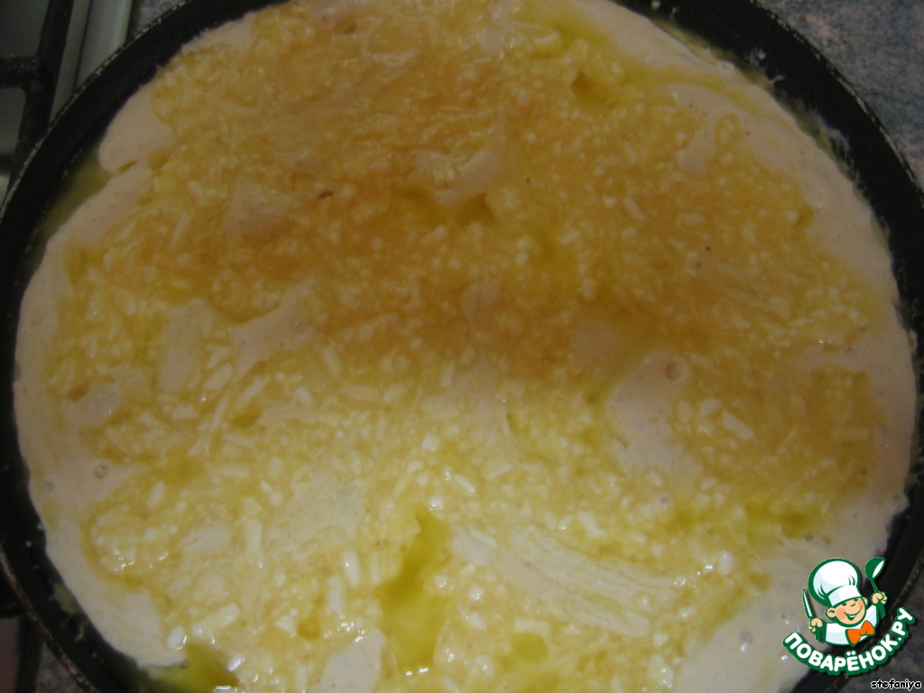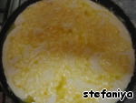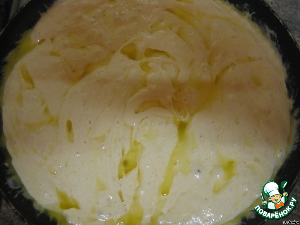 и распределяем эту смесь поверх теста (в идеале "начинка" должна утонуть в тесте ;-) )даём постоять тесту 5-10 мин. (я не давала :-) ..)