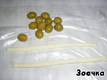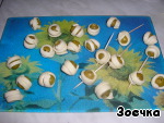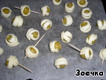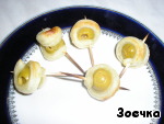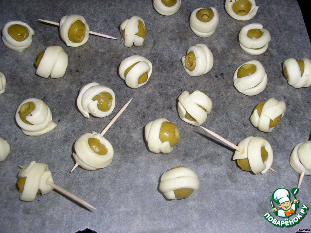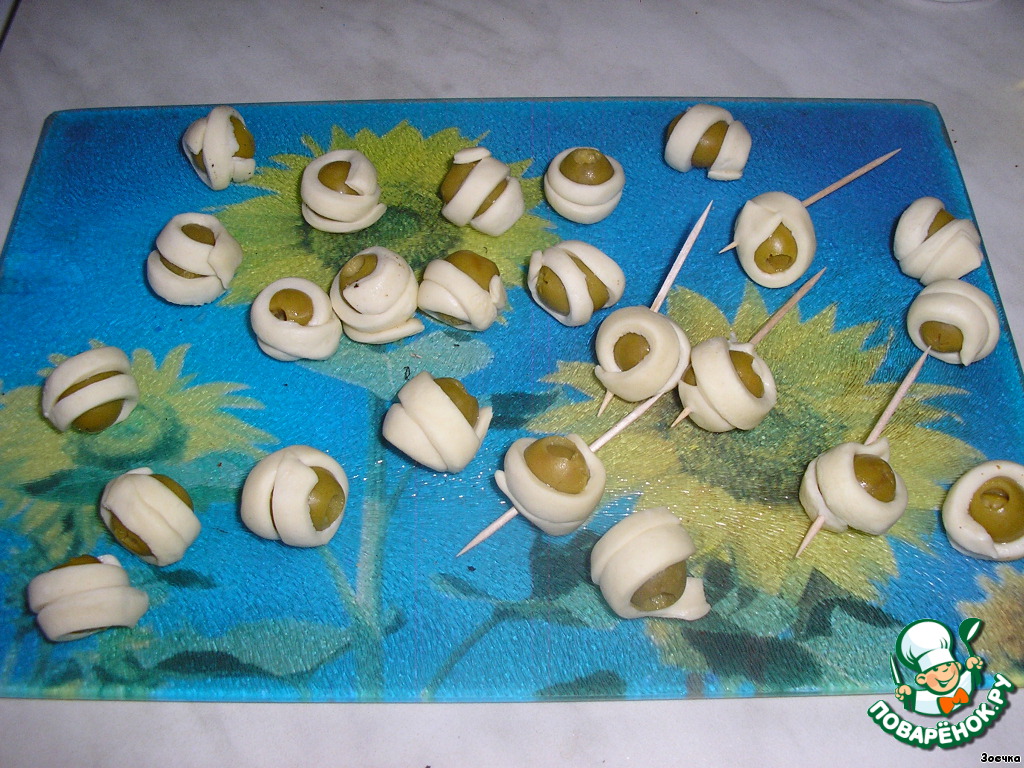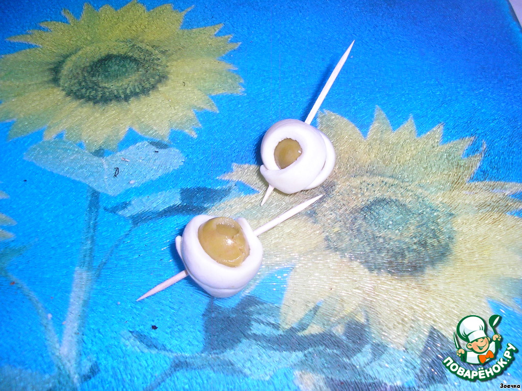 И обёртываем им оливку. Можно закрепить деревянной шпажкой.