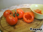 Моем помидоры, ложкой или ножиком аккуратно вынимаем серединку, мякоть помидора выложим в мисочку, так же делаем и с картошкой.