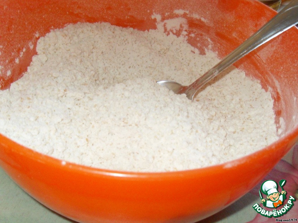 В миске смешать муку, 100 гр сахара, разрыхлитель, овсяные хлопья и молотый миндаль -