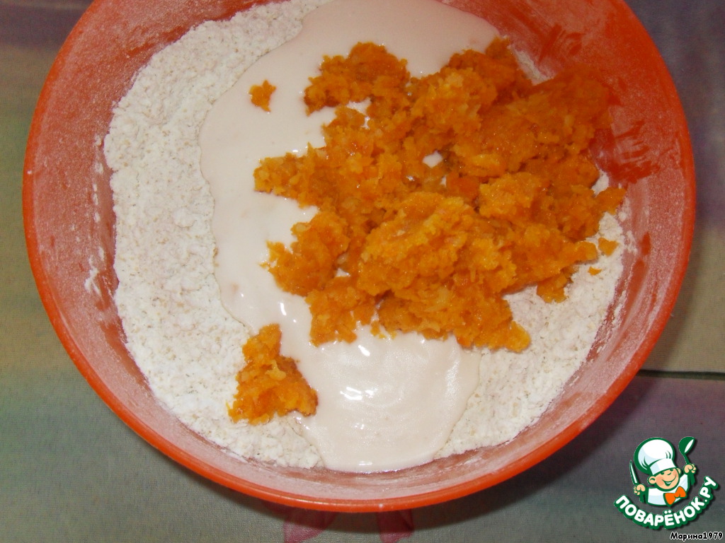 Йогурт (у меня была "Активиа", 2 баночки по 125 гр)слегка взбить с растительным маслом. Затем добавить в сухую смесь йогурт и измельченную курагу
