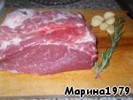 Кусок свинины (у меня шейка) нашпиговываем чесноком и розмарином (1 веточка). Натираем солью и перцем.
