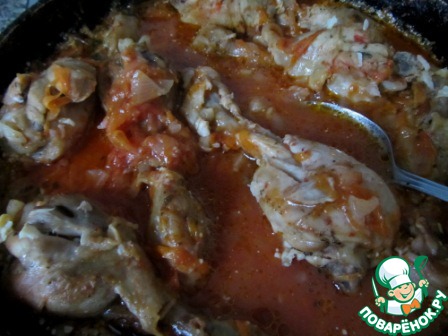 залить голени соусом, дать потушиться под крышкой минут 35 пока курица не станет совсем мягкой. В процессе ножки перевернуть с одной стороны на другую.