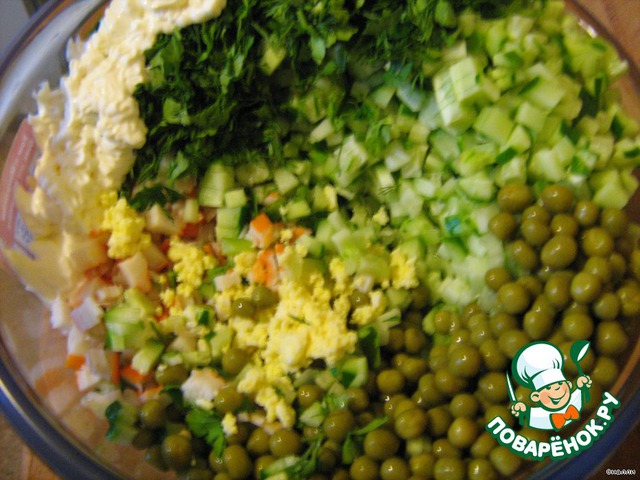 Соединить ингредиенты, добавить горошек, заправить майонезом