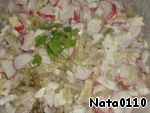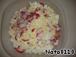 Смешиваем майонез со сметаной, добавляем в салат и перемешиваем.