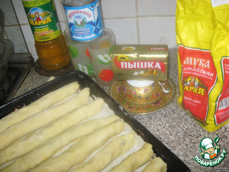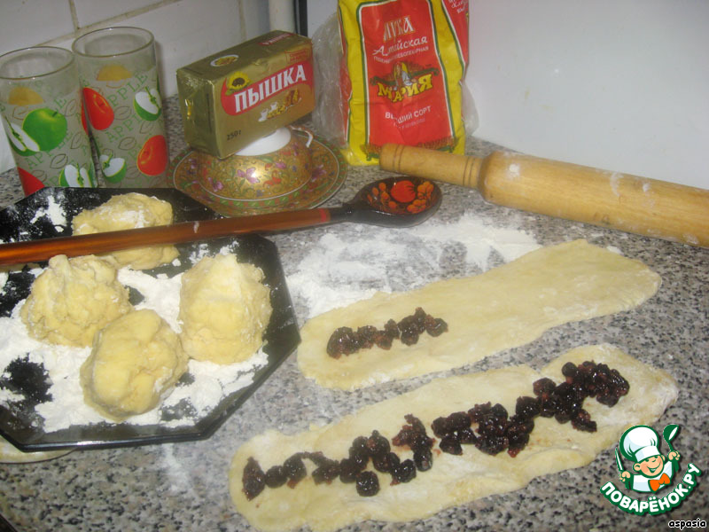 Вынимать по одному колобку и раскатывать в полоску. Выложить на каждую вишенки, свернуть трубочкой и переложить на противень для выпекания