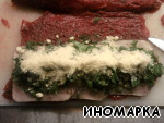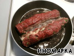 Сверните кусочек мяса с начинкой в рулет и обмотайте ниткой, чтоб не развернулся во время готовки.