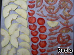 Нарезаем яблоко, помидор и клубничку ломтиками толщиной 1-2 мм. Промакаем салфеткой лишнюю жидкость и выкладываем наши ломтики на пергамент. Сушим в духовке при температуре 60 градусов до полного высыхания. Постоянно заглядываем, чтоб не сгорели. Можно перевернуть один раз.