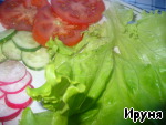Готовим тарелки для подачи - моем и обсушиваем помидоры, огурцы, редис и салат. Салат листом укладываем на тарелку, остальные овощи режем кружочками, выкладываем рядом, немного солим и перчим.