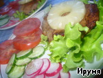 На лист салата выкладываем жареное мясо. Сверху на мясо кладем колечко ананаса. Очень вкусно, сочно и красиво! Приятного аппетита!
