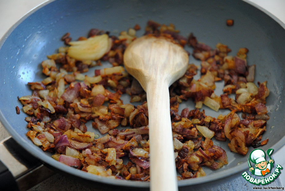 поджарить в столовой ложке масла до золотистого цвета лука. -