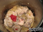 Кладем томатную пасту, зиру, соль и кориандр. Так же все обжариваем