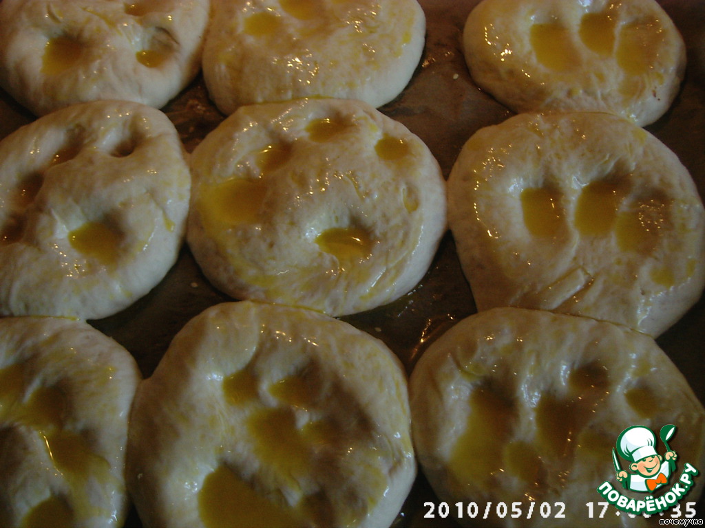 Снять плeнку с заготовок, костяшками пальцев сделать углубления в наших булочках, в которые налить масляную эмульсию, затем посыпать сверху розмарином, итальянскими травами и крупной морской (пищевой) солью.