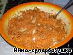 Заправить растительным маслом и все очень тщательно перемешать, чтобы мясо, лук и чеснок равномерно распределились в моркови.