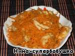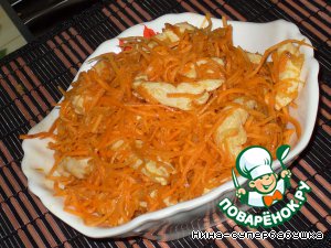 На первый взгляд может показаться, что это морковь по-корейски. На самом деле похоже только внешне. Рецепт совершенно другой. Гораздо проще, а получается нисколько не хуже. Очень вкусная вещь. Ингредиенты можно варьировать. Я готовила это блюдо с куриным филе, со свининой и даже с кальмарами. Все три варианта очень хороши. Мнения в семье разделились: мне больше всего нравится с курицей, дочке - с кальмарами, а мужу и сыну нравятся все три варианта!!!