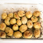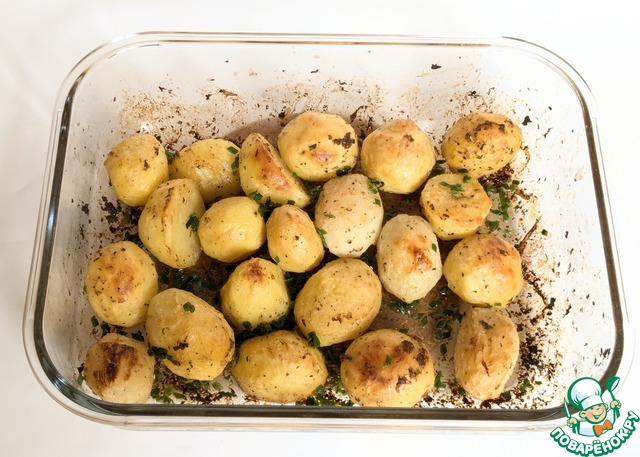 Картофель выложить в форму и запекать 25-30 минут. Один раз картофелины перевернуть, чтобы равномерно пропеклись.