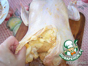 Кладем блинчики в курицу, курицу солим, перчим и зашиваем (или сцепляем зубочистками), запекаем до готовности (минут 35-40).