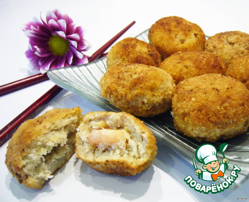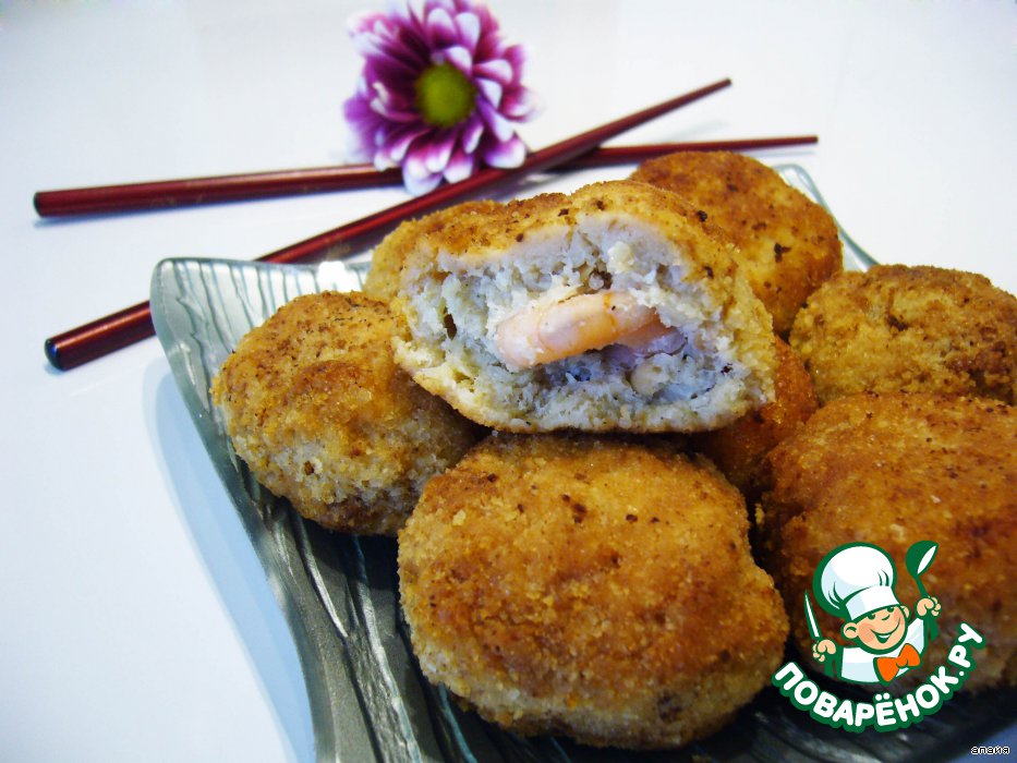 Сформировать лепешки. На каждую лепешку положить очищенную креветку и сформировать шарик.