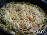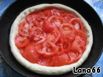 В смазанную маслом сковороду выкладываем тесто и придаём ему форму пиццы с бортиками. Очищенные помидоры нарезаем тонко кружками и укладываем внахлест. Солим слегка. -