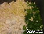 Чеснок, зелень, вареное куриное мясо измельчить.