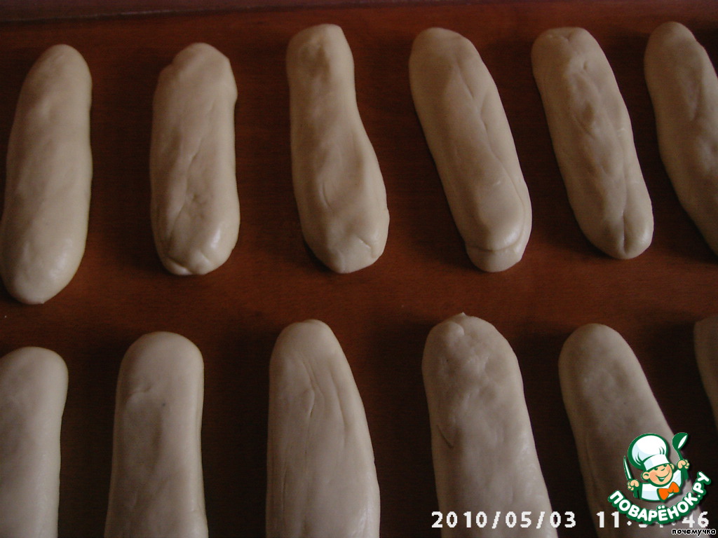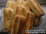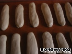 Расправить тесто в овал, край теста завернуть к центру и слегка придавить, так же поступить и с противоположным краем, захлестнув его на первый. Сложив батон по продольной оси, защипываем его как вареник. Переворачиваем булку швом вниз и даем немного отдохнуть, затем переворачиваем швом вверх, ребром руки вдоль шва делаем желобок и складываем булку вдвое по направлению желобка как бы он, этот желобок был осью. Повторяем эту операцию 2-3 раза, пока не получится упругий батончик. Дать расстояться на противне (минут 30), булка должна быть и мягкой и упругой одновременно. Надрезаем булку при помощи лезвия под очень острым углом, (у меня в доме лезвия не оказалось, я делала надрез ножом, поэтому он видимо и не получился таким как надо) т.е. лезвие должно почти горизонтально пройти вдоль по булке, надрез должен быть глубоким. -