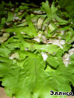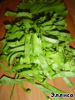 Тарелку выстилаем салатными листьями, а оставшиеся нарезаем соломкой,