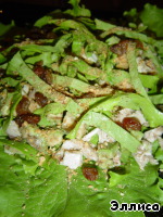 Посыпаем салат измельченным миндалем, изюмом, и поливаем приготовленным соусом.