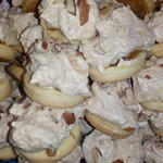 Взбиваем охлажденные белки миксером, добавляя постепенно сахар (лучше, конечно, сахарную пудру). Чтобы взбивалось лучше можно добавить лимонной кислоты. У меня после приготовления лимончелло оставалась проспиртованная лимонная цедра, пересыпанная сахаром. В дело ее! На кружки крема выкладываем цедру и безе, сверху присыпаем лепестками миндаля. На один противень ушла половина всего теста.