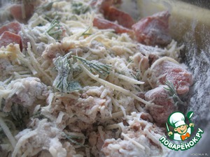 Консервированный отцедить от жидкости и мелко раздавить вилкой. Смешать в одной емкости муку, разрыхлитель, тертый сыр, оба лосося, перец, укроп, лук.