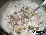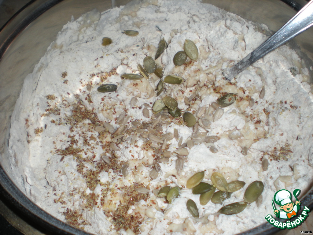 смешиваем все виды муки, соль, по ложке семечек каждого вида,все отруби,