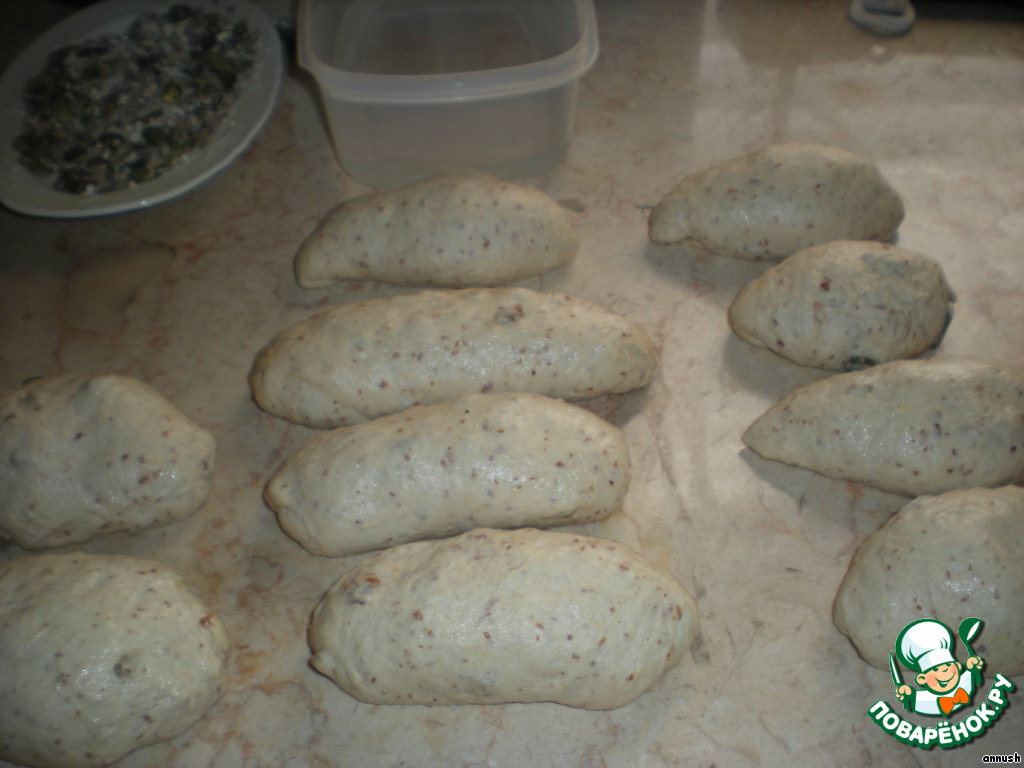 а булочки обсыпаем так: смачиваем верх в воде и сразу мокрой частью в тарелочку с семечками и на противень