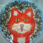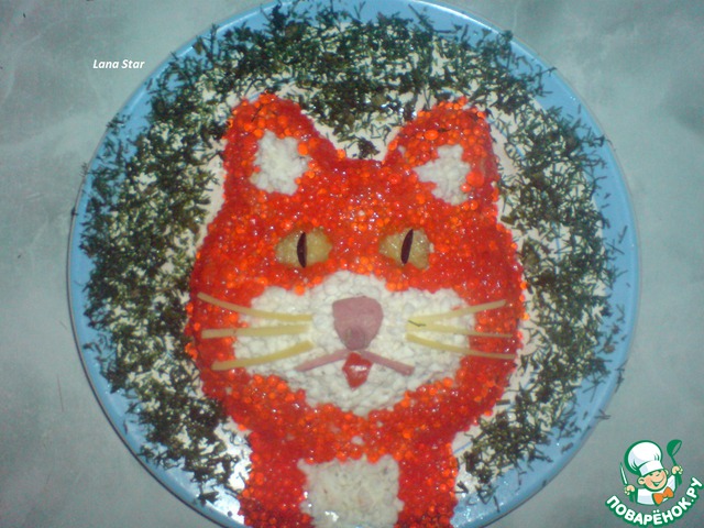 Выкладываем на блюдо, формируем мордочку кота, оформляем яичными окрашенными белками (белок одного яйца окрашиваем чаем, второго - шафраном, трем на средней тeрке, перемешиваем).
