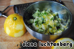 Оставшиеся яблоко и огурец нарезать мелкими кубиками, яблоко предварительно очистить. Сбрызнуть лимонным соком и добавить немного лимонной цедры и мелко нарубленной зелени фенхеля.