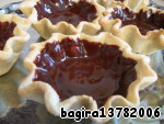Полученный ганаш разливаем по остывшим корзиночкам. С помощью кисточки или, поворачивая корзинки в разные стороны (представьте, что у вас в руках сковорода, на которой вы жарите блины), покроем шоколадным кремом боковины корзинки изнутри. Поставим пирожные минут на 30 в холодильник или морозильную камеру для быстрейшего застывания.
