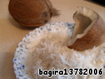 Кокос очистим от коричневой кожуры и натрем на мелкой терке. Свежий кокос можно заменить сухим, потому что, честно говоря, я не почувствовала кокосовый вкус (а так хотелось!) в пирожных, хотя, может быть, мне кокос неправильный попался.