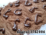 Шоколад (50 г) растопим и с помощью корнетика выложим на какао в виде любых фигурок. Какао должно быть довольно много, чтобы шоколад в нем "утонул". -