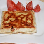 Делала с фило, колбасой и сыром. В случае с начинкой нужно следить, чтобы яйцо пропеклось, а не осталось сырым, а то совсем невкусно получается. И хорошо бы, чтобы тесто не было лохмотьями, рваным, а то яйцо вытекает.