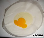 Лист фило раскладываем на тарелку, зрительно делим на две половины, в середину одной из половин разбиваем яйцо. Солим, перчим (делать надо все быстро, чтобы тесто не размокало). -