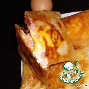 Я люблю первый вариант. Очень нежно получается. Муж мой любит посытнее. Тогда я сначала кладу немного тертого сыра, порезанной ветчины. Затем яйцо. А дальше все так же. Заворачиваем, жарим.