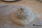 Нарезать листья свеклы (если ботвы нет, то можно сделать без нее), зеленый лук, зелень, все перемешать с творогом, соль по вкусу (много не надо, творог может потечь) и черный перец. У нас есть еще приправа, называется гедгин (разновидность чабреца), также добавляется в начинку. Все хорошенько перемешивается и скатывается в шарики величиной с кулак.