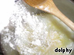 Уменьшите огонь до среднего и добавьте сразу всю муку.