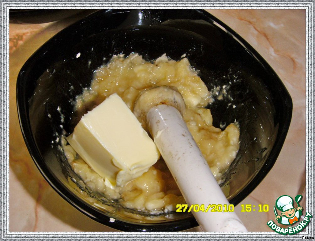 Принцип "пирамидок" такой же, что у ленивых котлетками "по-киевски", только в начинку добавляется мятый банан и сливочное масло. Источник - нашла в своей старой кулинарной тетрадке.