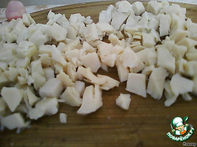 делай из сваренных кальмарах,так вкуснее и нежнее!!