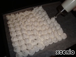 На противень, застеленный кондитерской бумагой, начинаем отсаживать (с помощью кондитерского шприца или кондитерского мешка) небольшие порции - одну за одной, с зазором в 1 мм или вообще без зазора.