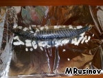Выкладываем скумбрию на фольгу (каждую рыбку отдельно), со всех сторон обкладываем мелко нарезанным луком. Можно добавить еще лавровых листочков