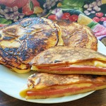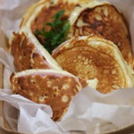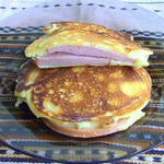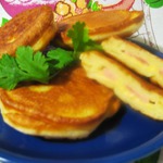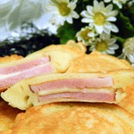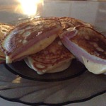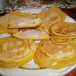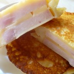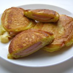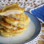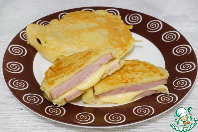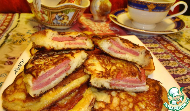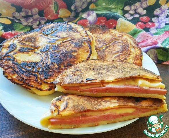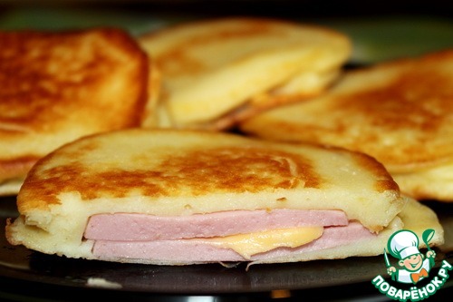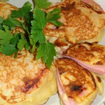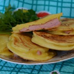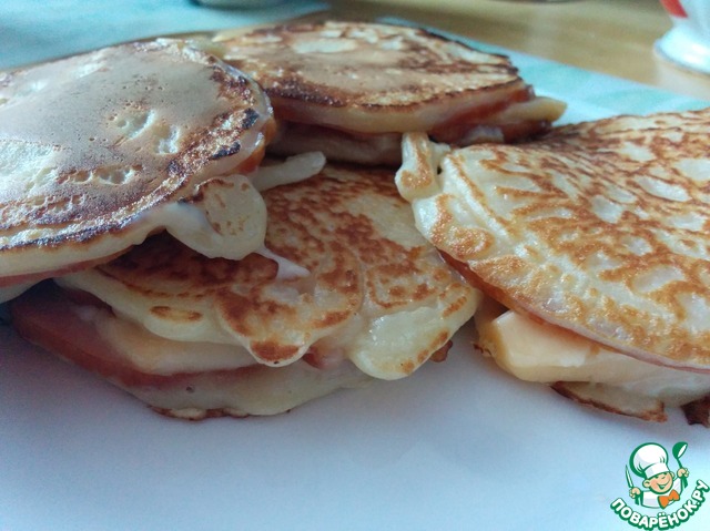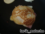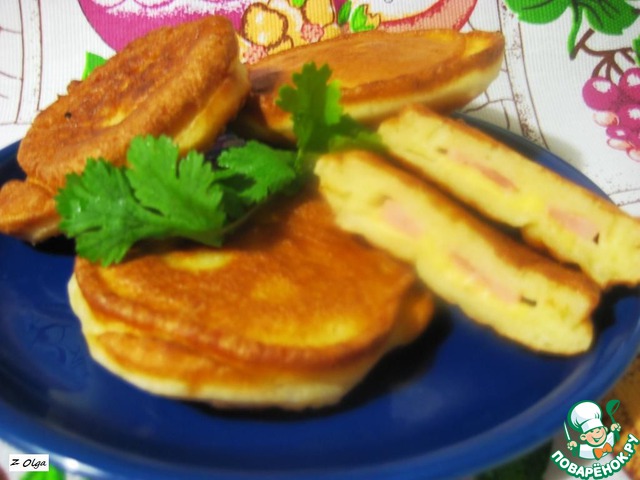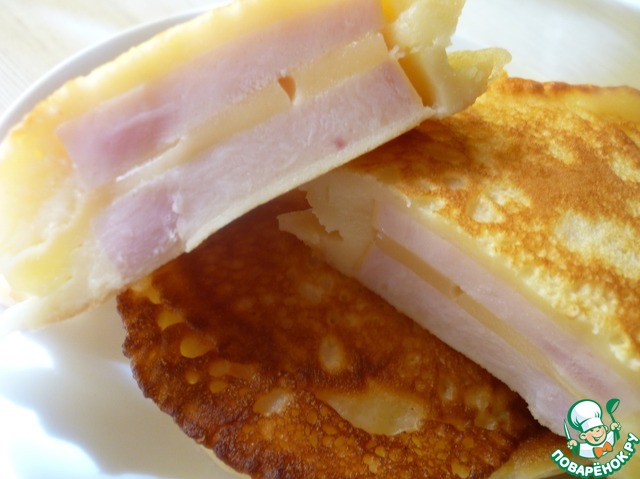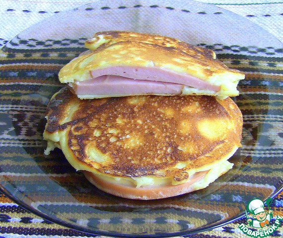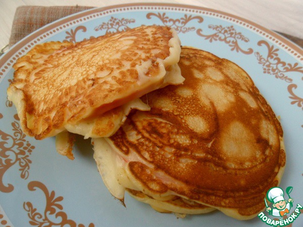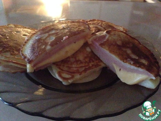 ветчины, не учтя, что у нее жестнея корочка, да и диаметр маловат, в итоге тесто стекло мимо, пришлось печь 2 отдельных оладья и класть друг на друга. Не хочу сдаваться, уж больно аппетитные фоты у всех получаются