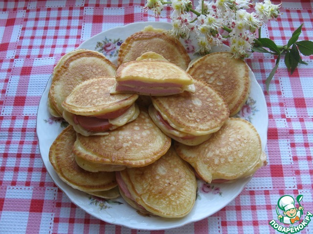 На раскаленную сковороду наливаем ложку теста, чтобы кружок был размером с колбаску. Как только тесто немного схватилось, кладем колбасу с начинкой. -