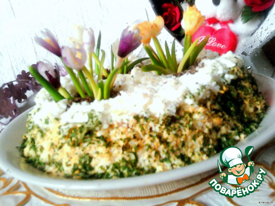 Для оформления: яйцо натереть на мелкой терке, добавить зелень, украсить бока салата. Верх салата украшаем белком и вареной печенью, натeртыми на мелкой терке. Из лука делаем цветы.