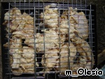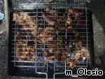 Выкладываем мясо на решетку для жарки и жарим на мангале 30-40 минут. Все зависит от размера кусочков.